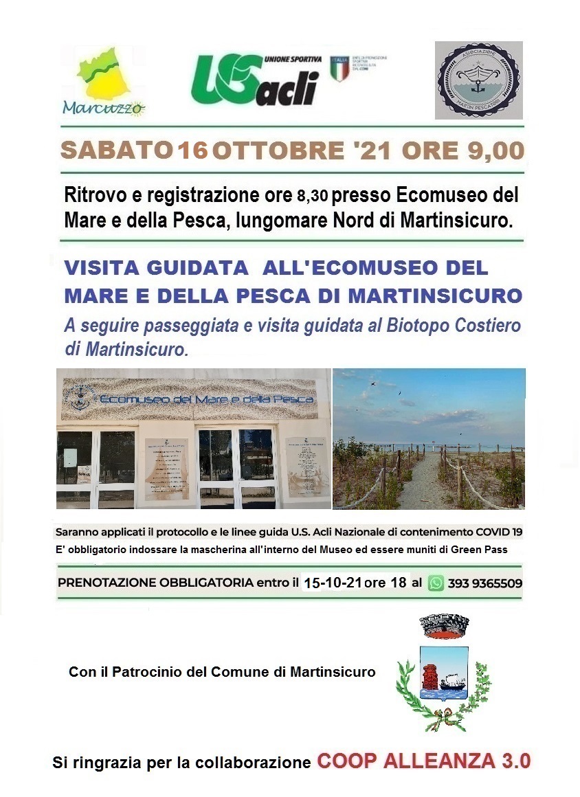 Il programma prevede che i partecipanti si ritrovino, muniti di mascherina e di Green Pass (solo per l’accesso all’interno del museo), presso l’Ecomuseo del Mare e della Pesca, per la registrazione e le incombenze previste dalla normativa anti-Covid, e dalle linee guida U.S. Acli Nazionale di contenimento Covid-19.