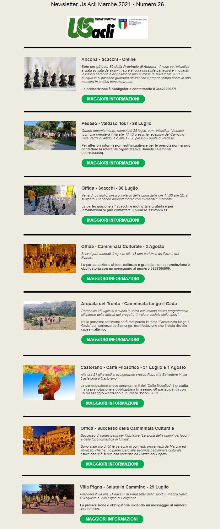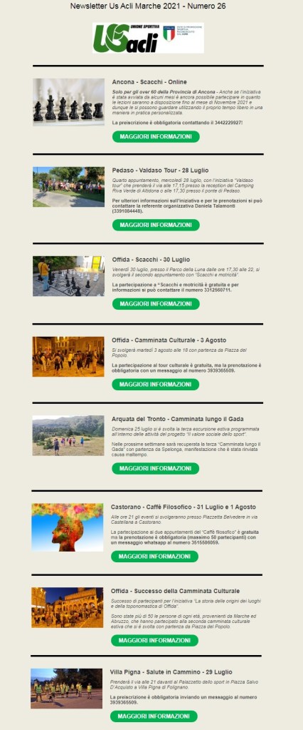 ottobre 15, 2021 Unione Sportiva Acli Marche Newsletter n. 26 del 28 Luglio 2021 Condividi: Fai clic per condividere su X (Si apre in una nuova finestra) X Fai clic per condividere su Facebook (Si apre in una nuova finestra) Facebook Mi piace Caricamento... Correlati