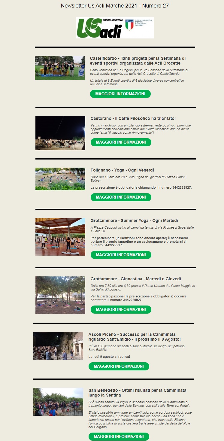ottobre 15, 2021 Unione Sportiva Acli Marche Newsletter n. 27 del 06 Agosto 2021 Condividi: Fai clic per condividere su X (Si apre in una nuova finestra) X Fai clic per condividere su Facebook (Si apre in una nuova finestra) Facebook Mi piace Caricamento... Correlati