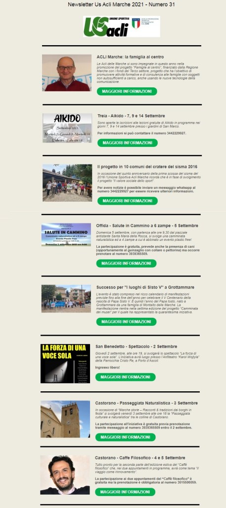 ottobre 15, 2021 Unione Sportiva Acli Marche Newsletter n. 31 del 01 Settembre 2021 Condividi: Fai clic per condividere su X (Si apre in una nuova finestra) X Fai clic per condividere su Facebook (Si apre in una nuova finestra) Facebook Mi piace Caricamento... Correlati