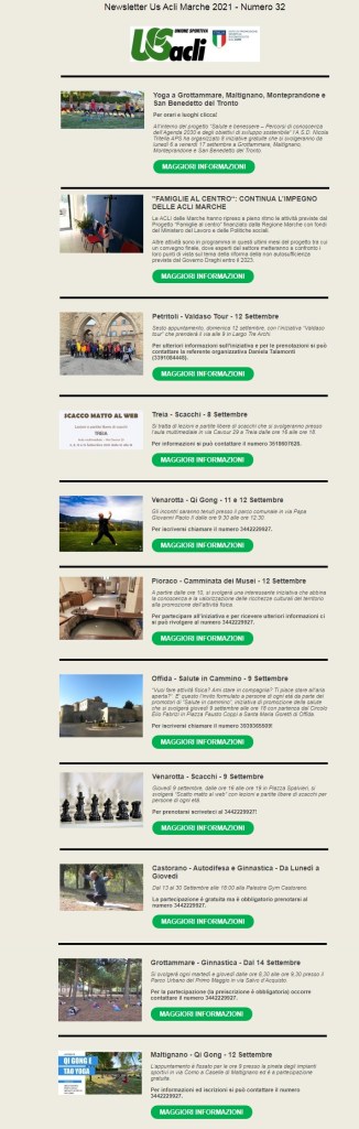 ottobre 15, 2021ottobre 15, 2021 Unione Sportiva Acli Marche Newsletter n. 32 del 08 Settembre 2021 Condividi: Fai clic per condividere su X (Si apre in una nuova finestra) X Fai clic per condividere su Facebook (Si apre in una nuova finestra) Facebook Mi piace Caricamento... Correlati