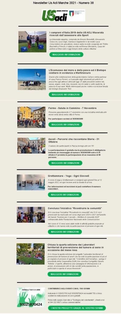 novembre 12, 2021 Unione Sportiva Acli Marche Newsletter n. 38 del 27 Ottobre 2021 Condividi: Fai clic per condividere su X (Si apre in una nuova finestra) X Fai clic per condividere su Facebook (Si apre in una nuova finestra) Facebook Mi piace Caricamento... Correlati