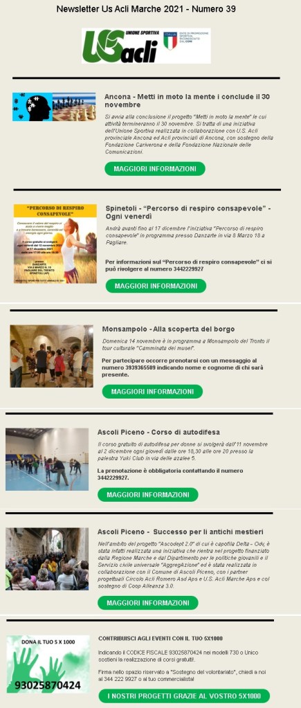 novembre 12, 2021 Unione Sportiva Acli Marche Newsletter n. 39 del 11 Novembre 2021 Condividi: Fai clic per condividere su X (Si apre in una nuova finestra) X Fai clic per condividere su Facebook (Si apre in una nuova finestra) Facebook Mi piace Caricamento... Correlati