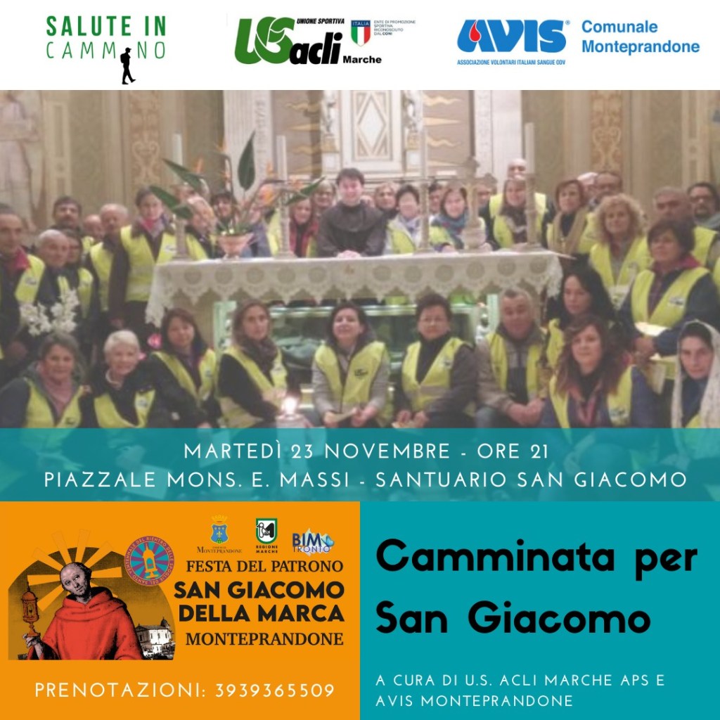 MONTEPRANDONE – Il 23 novembre, dopo la sospensione avvenuta nel 2020, torna l’appuntamento con la “Camminata per San Giacomo” che è giunta alla sesta edizione. L’iniziativa rientra nella linea di azione “Gli itinerari della fede” (giunta alla nona edizione) del progetto “Salute in cammino” ed abbina la promozione dell’attività fisica alla conoscenza e alla valorizzazione di chiese, conventi, strutture religiose e patroni delle nostre città. La manifestazione è organizzata dal comitato regionale dell’Unione Sportiva Acli Marche in collaborazione con Avis Monteprandone ed Amministrazione comunale di Monteprandone nell’ambito delle festività del patrono San Giacomo della Marca in programma dal 20 al 28 novembre 2021. Il programma dell’iniziativa prevede la partenza martedì 23 novembre alle 21 dal Piazzale Mons. Eugenio Massi (Santuario di San Giacomo della Marca) e poi l’arrivo a Monteprandone davanti alla casa natale del Santo. Il gruppo, poi, tornerà sul punto di partenza. Prenotazioni al numero 3939365509