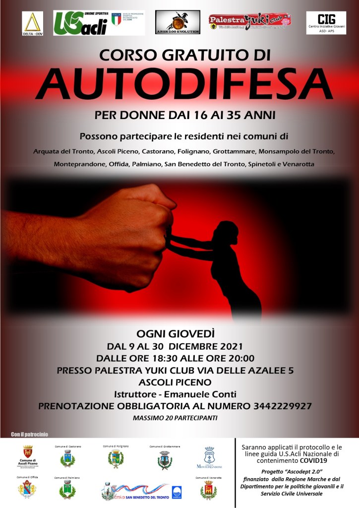 ASCOLI – Sono aperte le iscrizioni ad un nuovo corso gratuito di autodifesa per donne che si svolgerà dal 9 dicembre al 30 dicembre ogni giovedì dalle ore 18,30 alle ore 20 presso la palestra Yuki Club in via delle azalee 5.