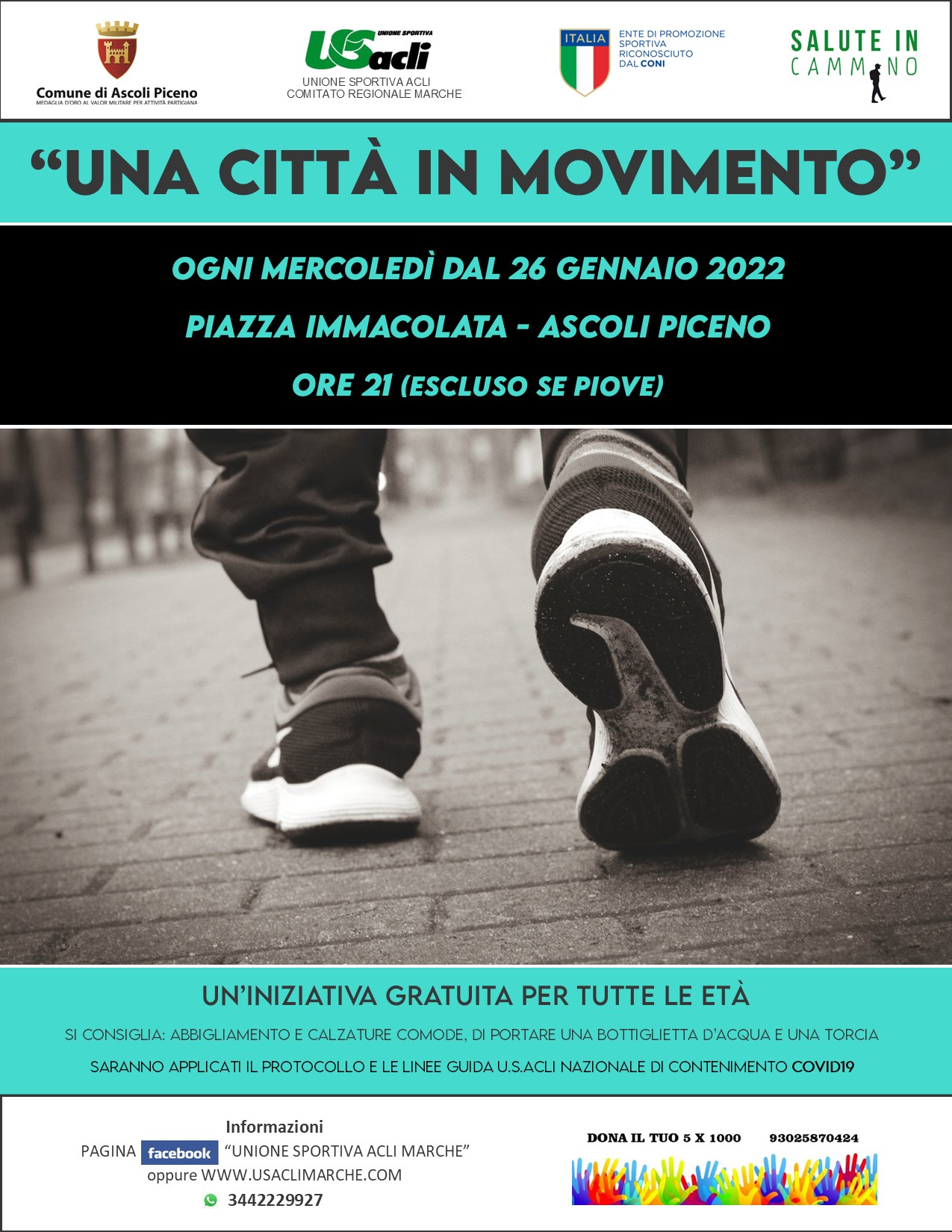ASCOLI – Dal 26 gennaio riprendono le camminate serali dell’iniziativa “Una città in movimento”, realizzata dall’Unione Sportiva Acli Marche Aps con il patrocinio dell’amministrazione comunale di Ascoli Piceno nell’ambito dell’iniziativa “Sport senza età”.