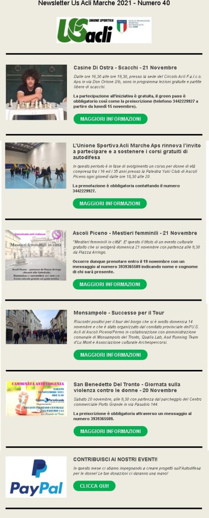 marzo 15, 2022 Unione Sportiva Acli Marche Newsletter n. 40 del 17 Novembre 2021 Condividi: Fai clic per condividere su X (Si apre in una nuova finestra) X Fai clic per condividere su Facebook (Si apre in una nuova finestra) Facebook Mi piace Caricamento... Correlati