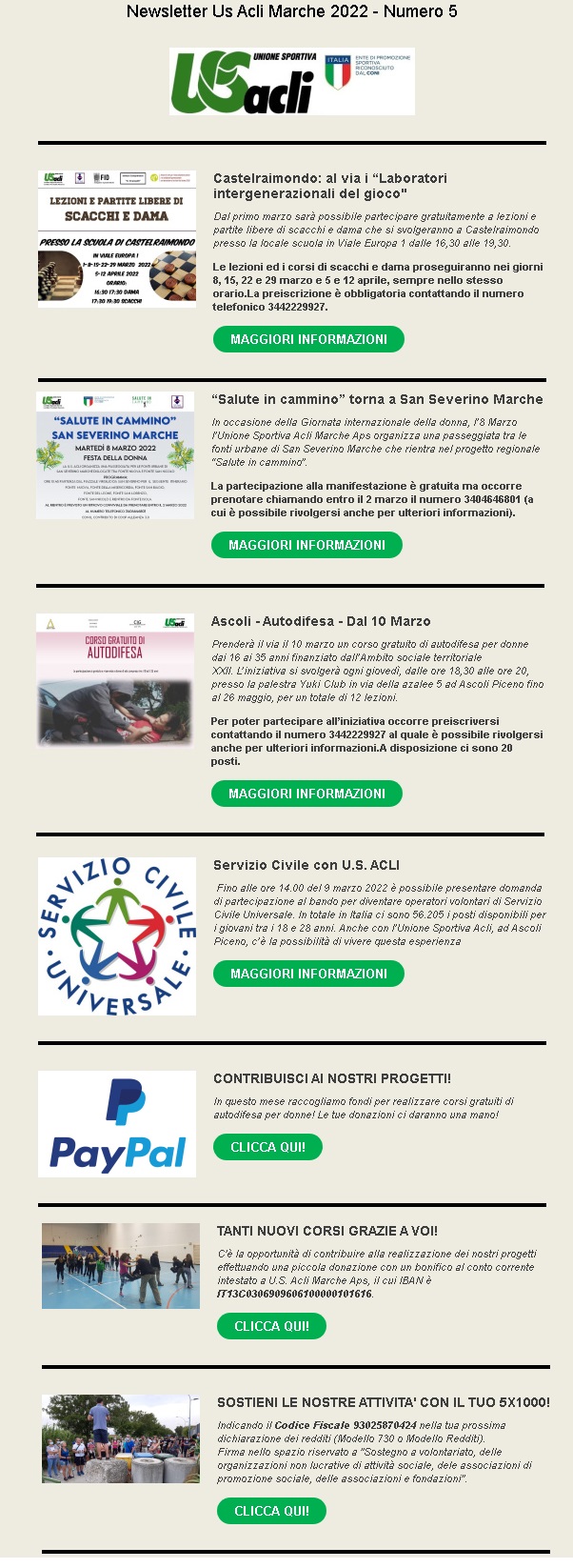 marzo 15, 2022 Unione Sportiva Acli Marche Newsletter n. 5 del 28 Febbraio 2022 Condividi: Fai clic per condividere su X (Si apre in una nuova finestra) X Fai clic per condividere su Facebook (Si apre in una nuova finestra) Facebook Mi piace Caricamento... Correlati