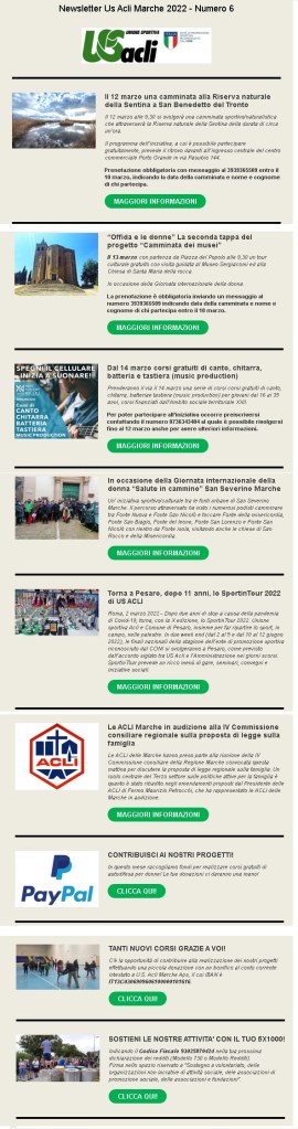 marzo 15, 2022 Unione Sportiva Acli Marche Newsletter n. 6 del 10 Marzo 2022 Condividi: Fai clic per condividere su X (Si apre in una nuova finestra) X Fai clic per condividere su Facebook (Si apre in una nuova finestra) Facebook Mi piace Caricamento... Correlati