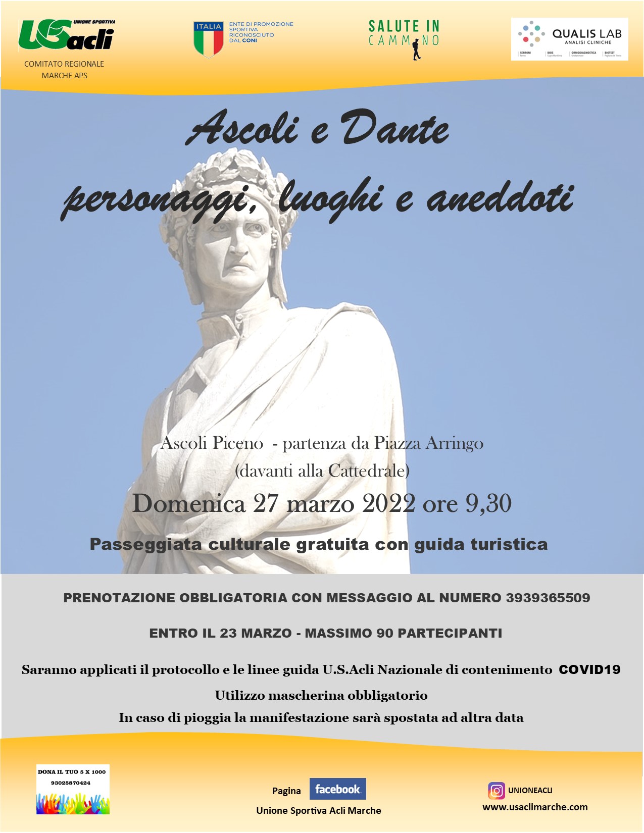 Domenica 27 marzo, con partenza alle ore 9,30 davanti alla Cattedrale di Ascoli Piceno in piazza Arringo, prenderà il via “Ascoli e Dante: personaggi, luoghi e aneddoti”, iniziativa gratuita a cura di Unione Sportiva Acli Marche Aps
