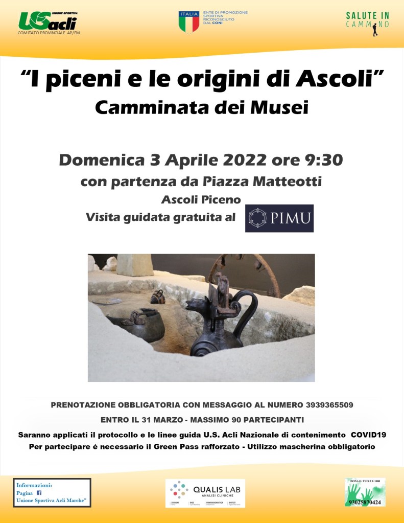 L’U.S. Acli provinciale organizza l’iniziativa “I piceni e le origini di Ascoli – Camminata dei musei” che si svolgerà il 3 aprile con partenza da Piazza Matteotti alle 9,30 ad Ascoli Piceno.