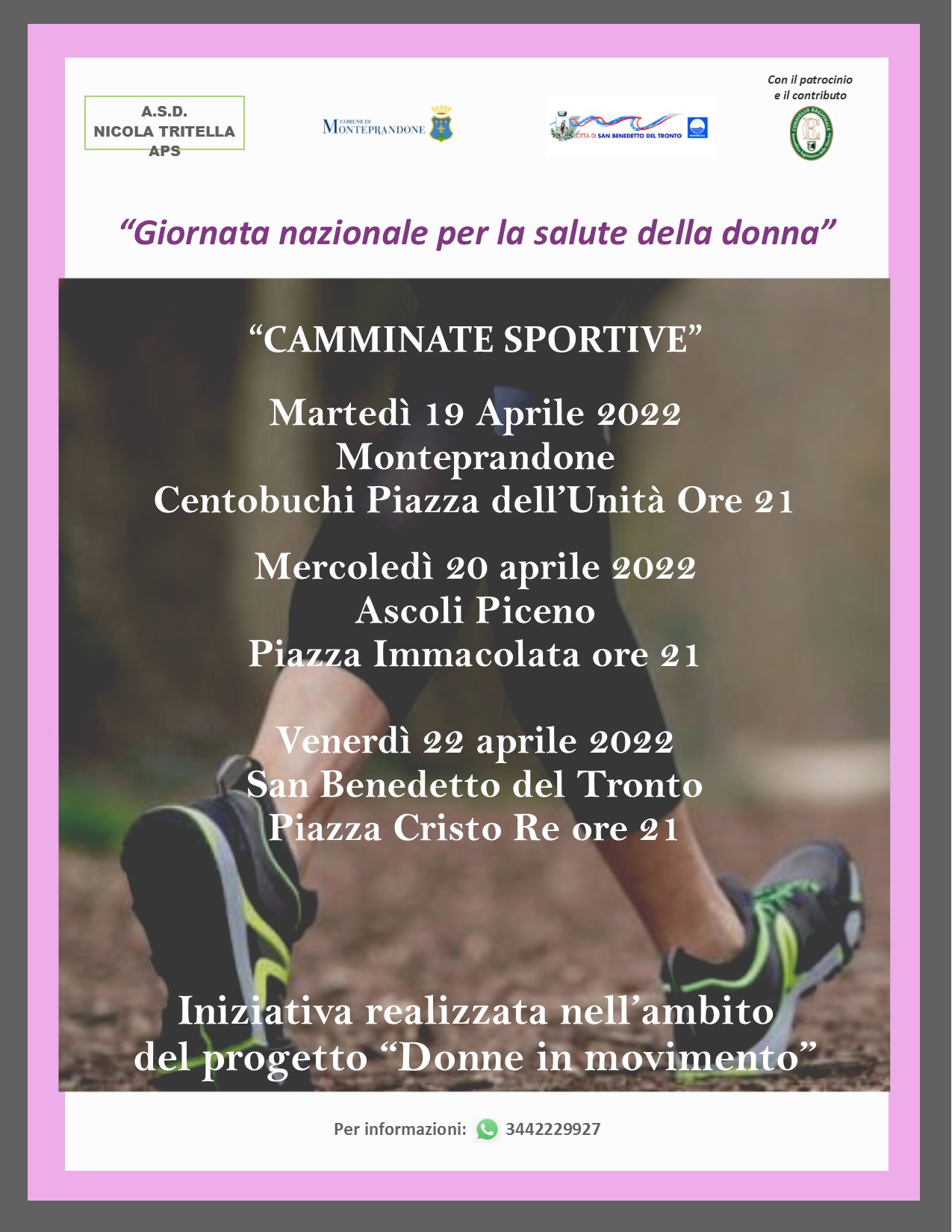 In occasione della Giornata nazionale per la salute della donna l’A.S.D. Nicola Tritella U.S. Acli Aps, col patrocinio e il contributo del Consiglio Regionale – Assemblea legislativa delle Marche, organizza tre camminate sportive nell’ambito del progetto “Donne in movimento”.