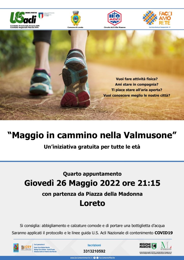 “Maggio in cammino nella Valmusone” è una iniziativa organizzata da Unione Sportiva Acli Ancona e Marche Aps, Circolo Acli Villa Musone, con il patrocinio dell’amministrazione comunale di Loreto, nell’ambito del progetto “Facciamo rete – Terzo settore Marche per l’emergenza Covid19, finanziato dalla Regione Marche con risorse statali del Ministero del Lavoro e delle Politiche sociali”.