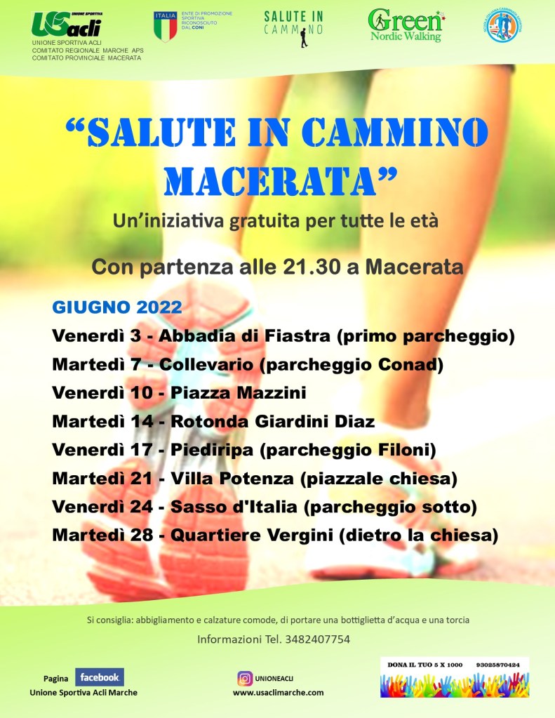 MACERATA – “Salute in cammino”, il progetto di promozione dell’attività fisica, proseguirà anche nel mese di Giugno con una serie di camminate aperte a cittadini di ogni età.