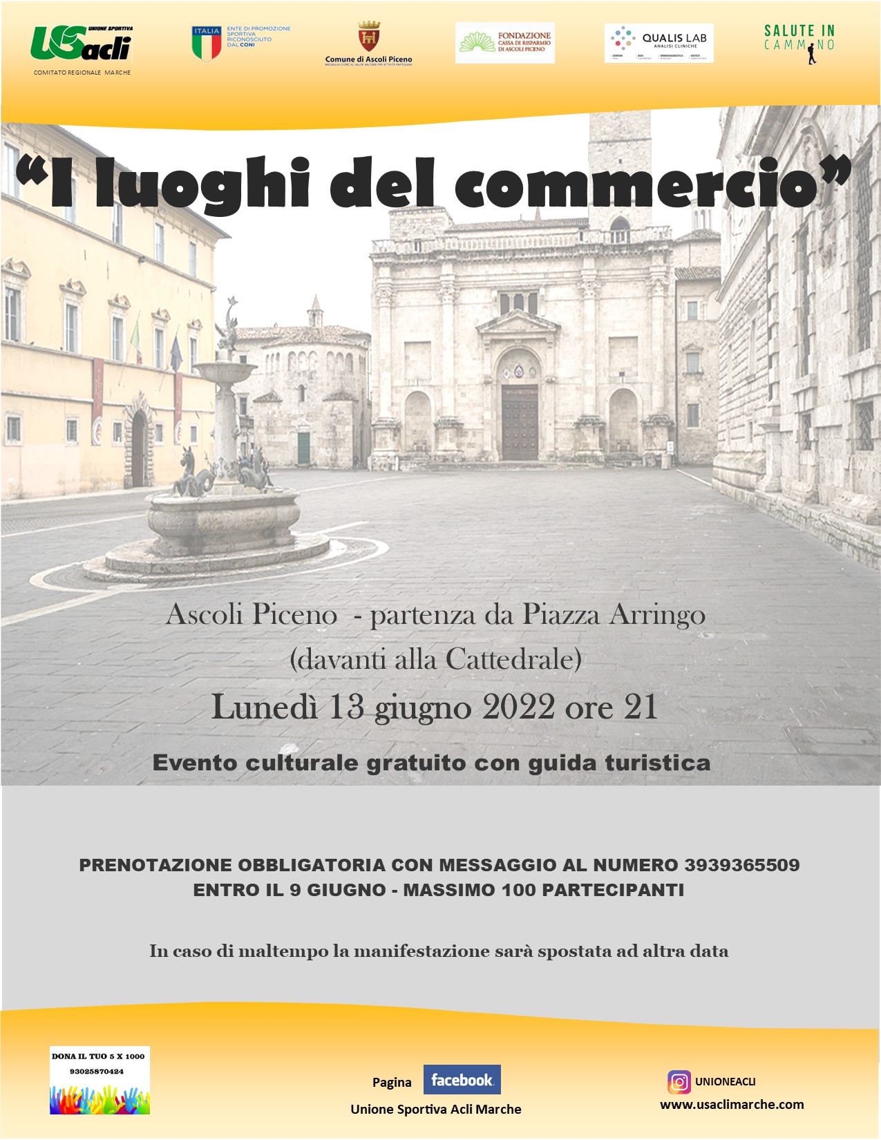 “Salute in cammino per la cultura” è promosso dall’Unione Sportiva Acli Marche e realizzato grazie al contributo di Fondazione Cassa di risparmio di Ascoli Piceno e Comune di Ascoli Piceno e di Qualis Lab – Analisi Cliniche.