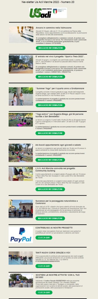 giugno 23, 2022luglio 17, 2022 Unione Sportiva Acli Marche Newsletter n. 20 del 23 Giugno 2022 Condividi: Fai clic per condividere su X (Si apre in una nuova finestra) X Fai clic per condividere su Facebook (Si apre in una nuova finestra) Facebook Mi piace Caricamento... Correlati