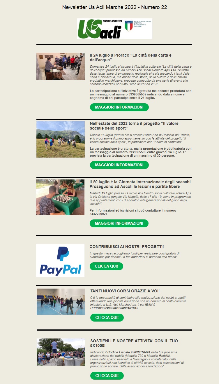 luglio 13, 2022luglio 17, 2022 Unione Sportiva Acli Marche Newsletter n. 22 del 13 Luglio 2022 Condividi: Fai clic per condividere su X (Si apre in una nuova finestra) X Fai clic per condividere su Facebook (Si apre in una nuova finestra) Facebook Mi piace Caricamento... Correlati