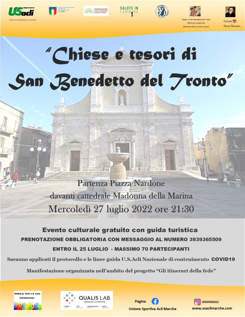 “Chiese e tesori di San Benedetto del Tronto” rientra nel progetto “Gli itinerari della fede” che l’Unione Sportiva Acli Marche Aps sta portando avanti nel territorio regionale e che ha permesso a tanti cittadini di conoscere meglio, dal punto di vista storico, culturale ed architettonico, chiese, conventi ed altre strutture religiose.