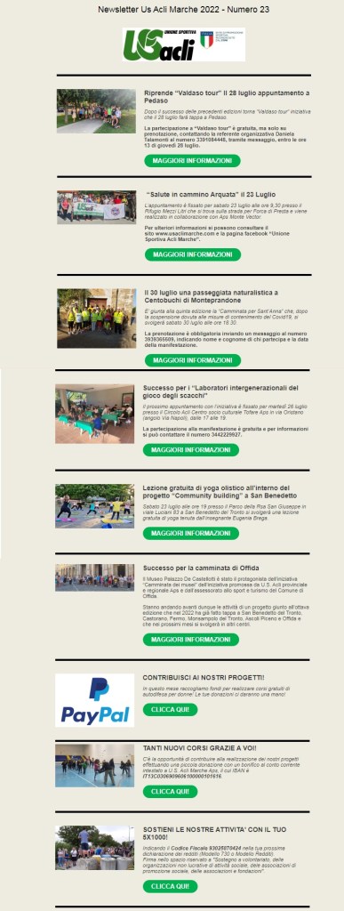 luglio 22, 2022 Unione Sportiva Acli Marche Newsletter n. 23 del 21 Luglio 2022 Condividi: Fai clic per condividere su X (Si apre in una nuova finestra) X Fai clic per condividere su Facebook (Si apre in una nuova finestra) Facebook Mi piace Caricamento... Correlati
