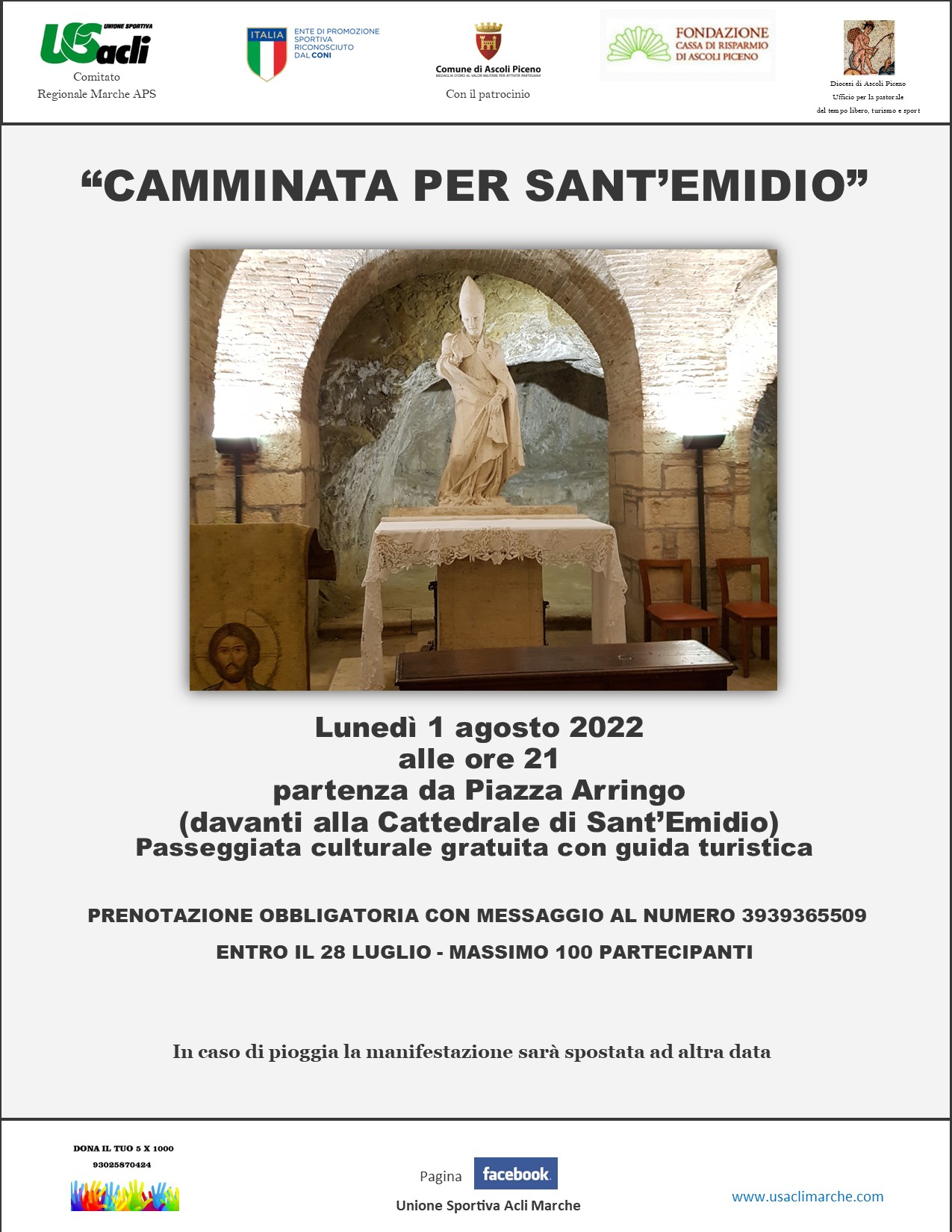 La “Camminata per Sant’Emidio”, sui luoghi del patrono della città, è divenuta ormai un classico appuntamento estivo visto che la prima edizione della manifestazione si è svolta nel 2015 e quella di lunedì 1 agosto sarà la decima visto che nel 2020 e nel 2021 sono stati realizzati due appuntamenti viste le limitazioni al numero dei partecipanti causa le misure di contenimento del Covid 19.