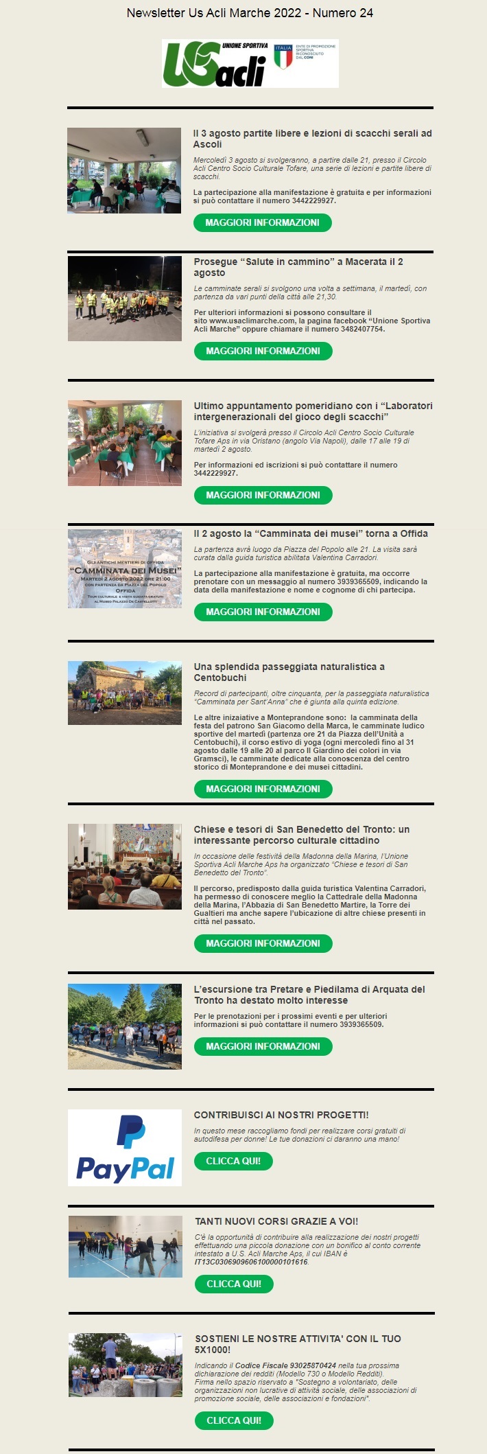 agosto 4, 2022 Unione Sportiva Acli Marche Newsletter n. 24 del 3 Agosto 2022 Condividi: Fai clic per condividere su X (Si apre in una nuova finestra) X Fai clic per condividere su Facebook (Si apre in una nuova finestra) Facebook Mi piace Caricamento... Correlati