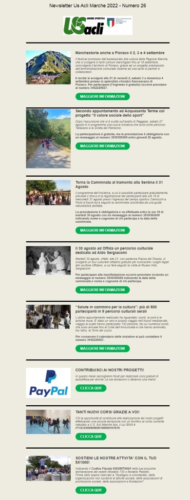 agosto 25, 2022 Unione Sportiva Acli Marche Newsletter n. 26 del 25 Agosto 2022 Condividi: Fai clic per condividere su X (Si apre in una nuova finestra) X Fai clic per condividere su Facebook (Si apre in una nuova finestra) Facebook Mi piace Caricamento... Correlati