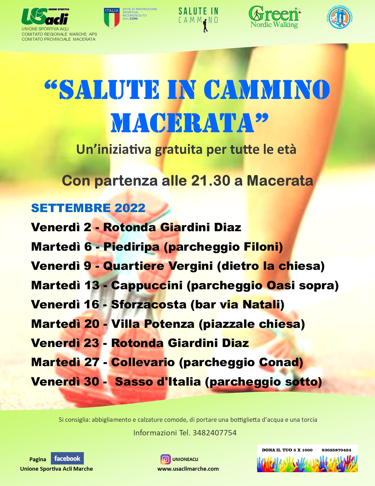 Si tratta di una iniziativa organizzata dall’U.S. Acli Marche Aps, dall’U.S. Acli provinciale di Macerata Aps, dalla Scuola italiana di camminata sportiva, dall’Asd Green Nordic Walking, e vuole combattere la sedentarietà e l’inattività fisica.