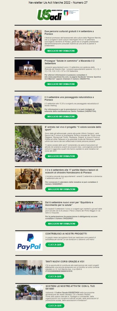 agosto 31, 2022 Unione Sportiva Acli Marche Newsletter n. 27 del 31 Agosto 2022 Condividi: Fai clic per condividere su X (Si apre in una nuova finestra) X Fai clic per condividere su Facebook (Si apre in una nuova finestra) Facebook Mi piace Caricamento... Correlati