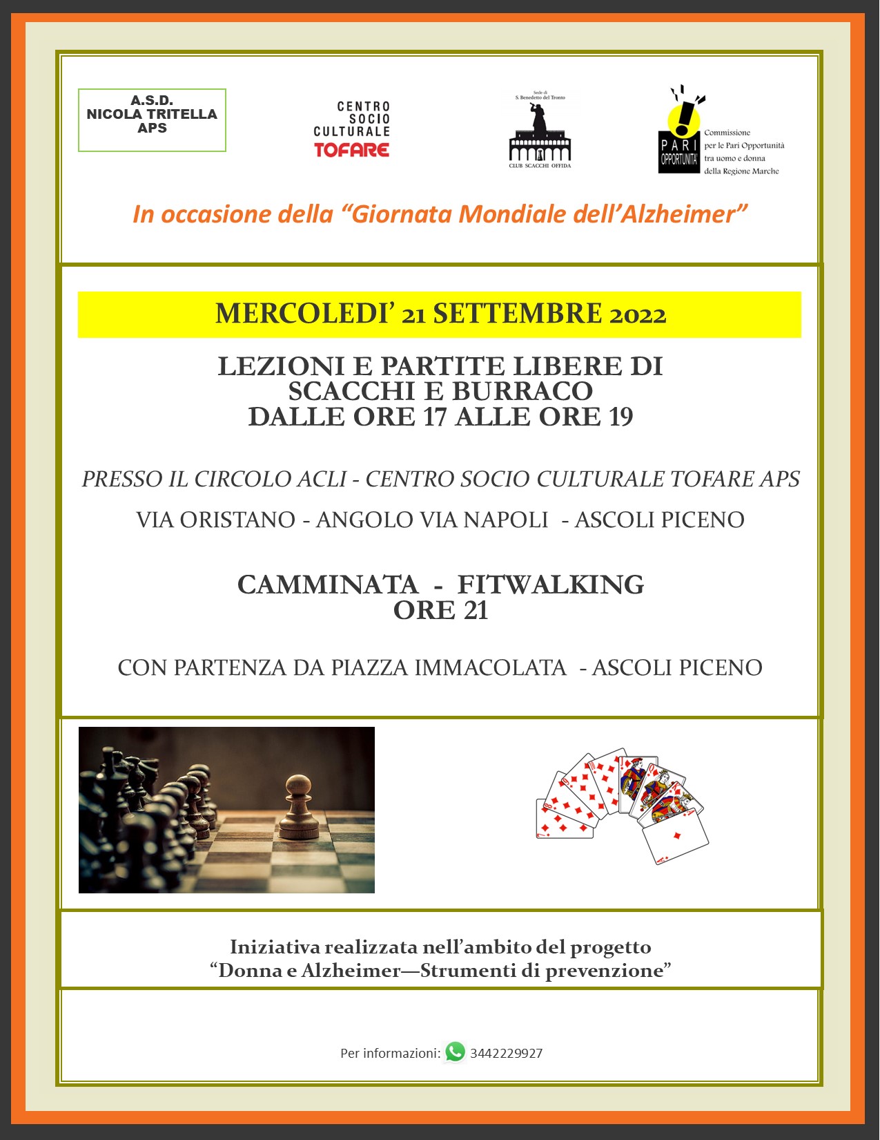 In occasione della Giornata mondiale dell’Alzheimer, il 21 settembre, sono in programma due iniziative ad Ascoli Piceno. Le attività sono organizzate da ASD Aps Nicola Tritella, Circolo Acli Centro Socio culturale Tofare Aps e Club scacchi Offida, col patrocinio e il contributo della Commissione per le pari opportunità tra uomo e donna della Regione Marche.