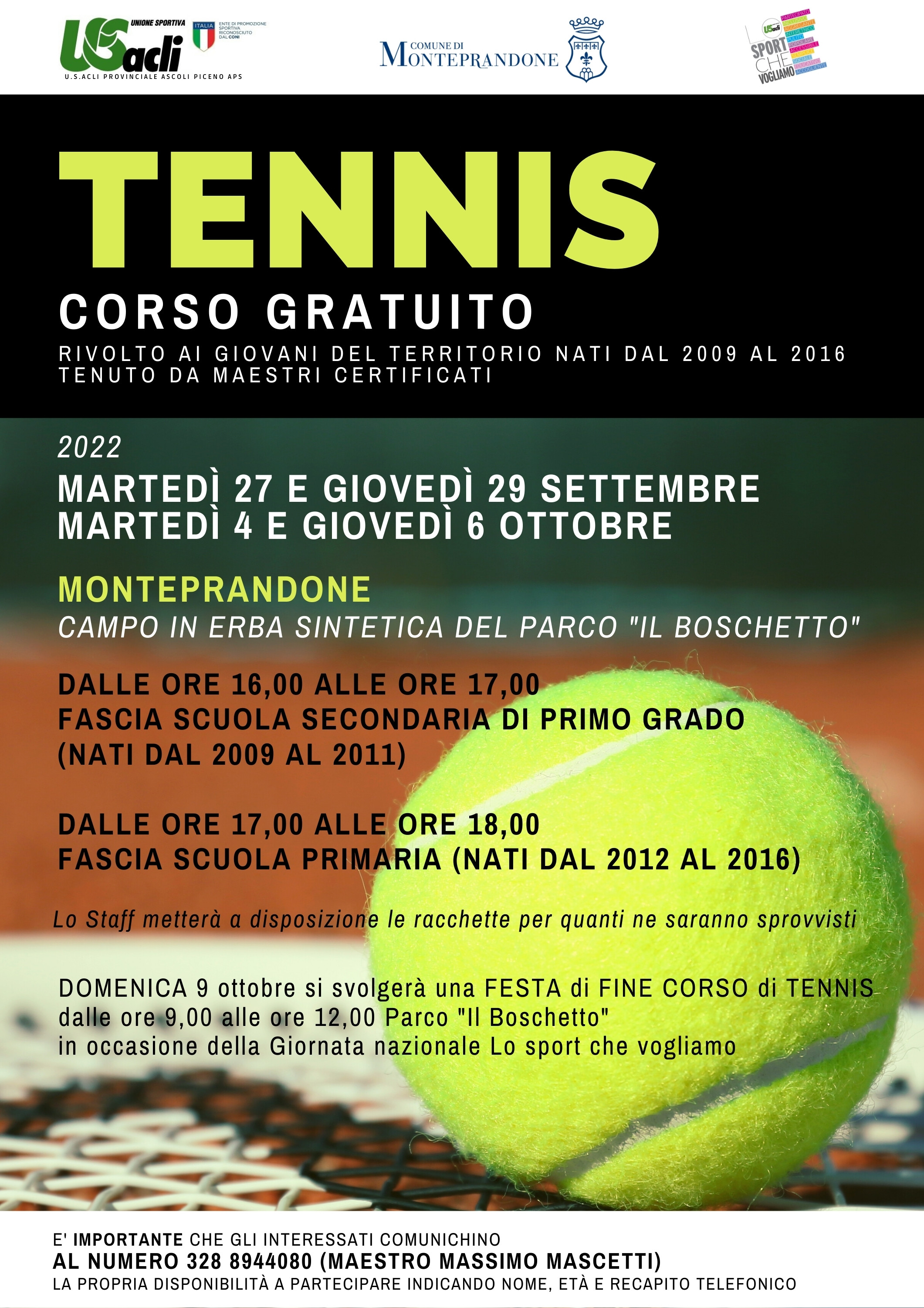 MONTEPRANDONE – Prenderà il via martedì 27 settembre un corso gratuito di tennis riservato ai giovani dal 2009 al 2016 e tenuto da maestri certificati.