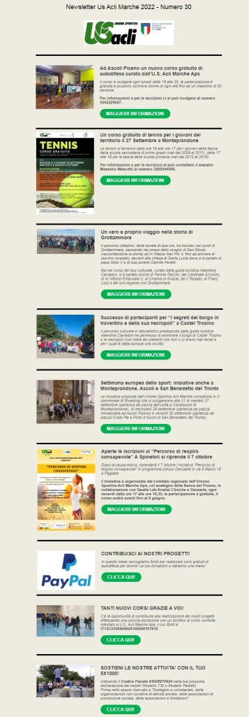 settembre 27, 2022settembre 30, 2022 Unione Sportiva Acli Marche Newsletter n. 30 del 27 Settembre 2022 Condividi: Fai clic per condividere su X (Si apre in una nuova finestra) X Fai clic per condividere su Facebook (Si apre in una nuova finestra) Facebook Mi piace Caricamento... Correlati