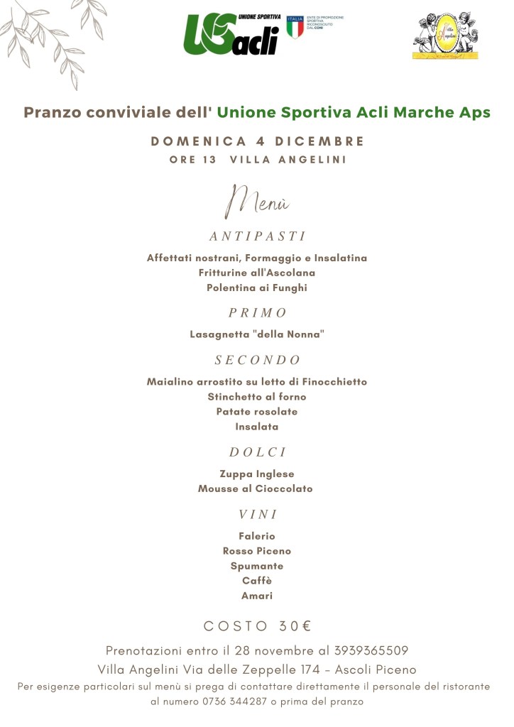 Vi aspettiamo al pranzo di fine anno che abbiamo organizzato per *domenica 4 dicembre ad Ascoli Presso Villa Angelini* in via delle zeppelle. Prenotazioni entro il *28 novembre* al numero *3939365509*. Nel volantino potete trovare il menù e tutte le informazioni utili. Il costo è di 30 euro. Nella mattinata del 4 dicembre ci saranno anche una visita guidata gratuita al *Museo archeologico* ed alla città di Ascoli. Nel corso del pranzo ci saranno anche delle premiazioni.