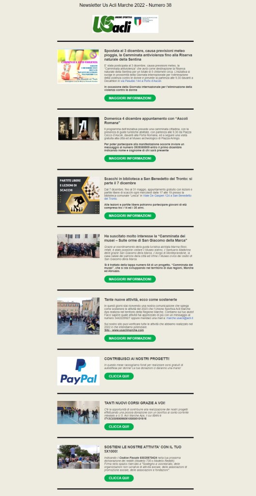 dicembre 1, 2022 Unione Sportiva Acli Marche Newsletter n. 38 del 1 Dicembre 2022 Condividi: Fai clic per condividere su X (Si apre in una nuova finestra) X Fai clic per condividere su Facebook (Si apre in una nuova finestra) Facebook Mi piace Caricamento... Correlati
