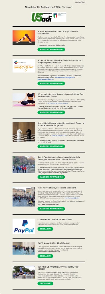 gennaio 3, 2023 Unione Sportiva Acli Marche Newsletter n.1 del 3 gennaio 2023 Condividi: Fai clic per condividere su X (Si apre in una nuova finestra) X Fai clic per condividere su Facebook (Si apre in una nuova finestra) Facebook Mi piace Caricamento... Correlati