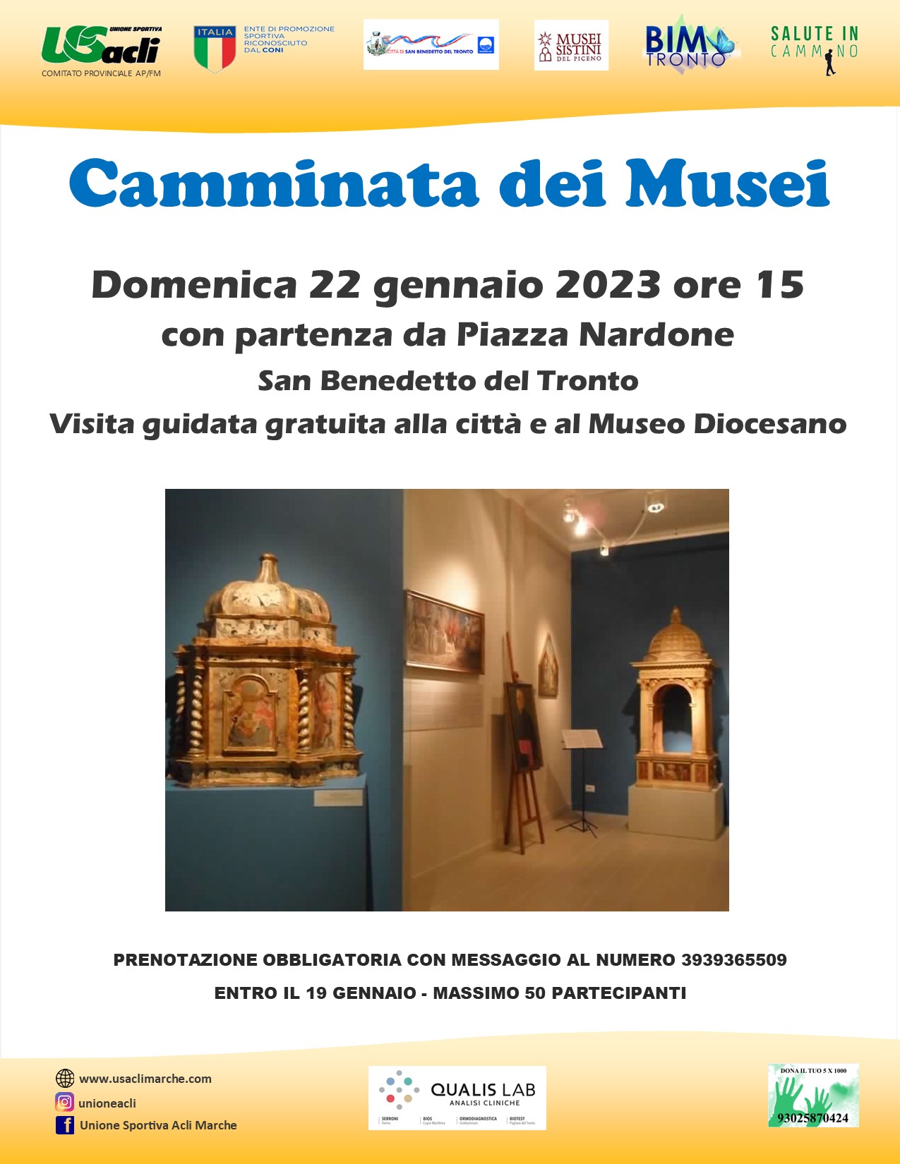 Il progetto “Camminata dei musei” è stato avviato nel 2015 e in 8 anni di attività il progetto “Camminata dei musei” ha fatto registrare più di 2600 presenze in 68 appuntamenti che hanno coinvolto strutture museali di diverse dimensioni e di tante città (Ascoli, Acquaviva Picena, Colli, Pioraco, Cossignano, Fermo, Grottammare, Monsampolo del Tronto, Monteprandone, San Benedetto del Tronto, Montedinove, Venarotta, Castorano Martinsicuro, Offida e Cupra Marittima).