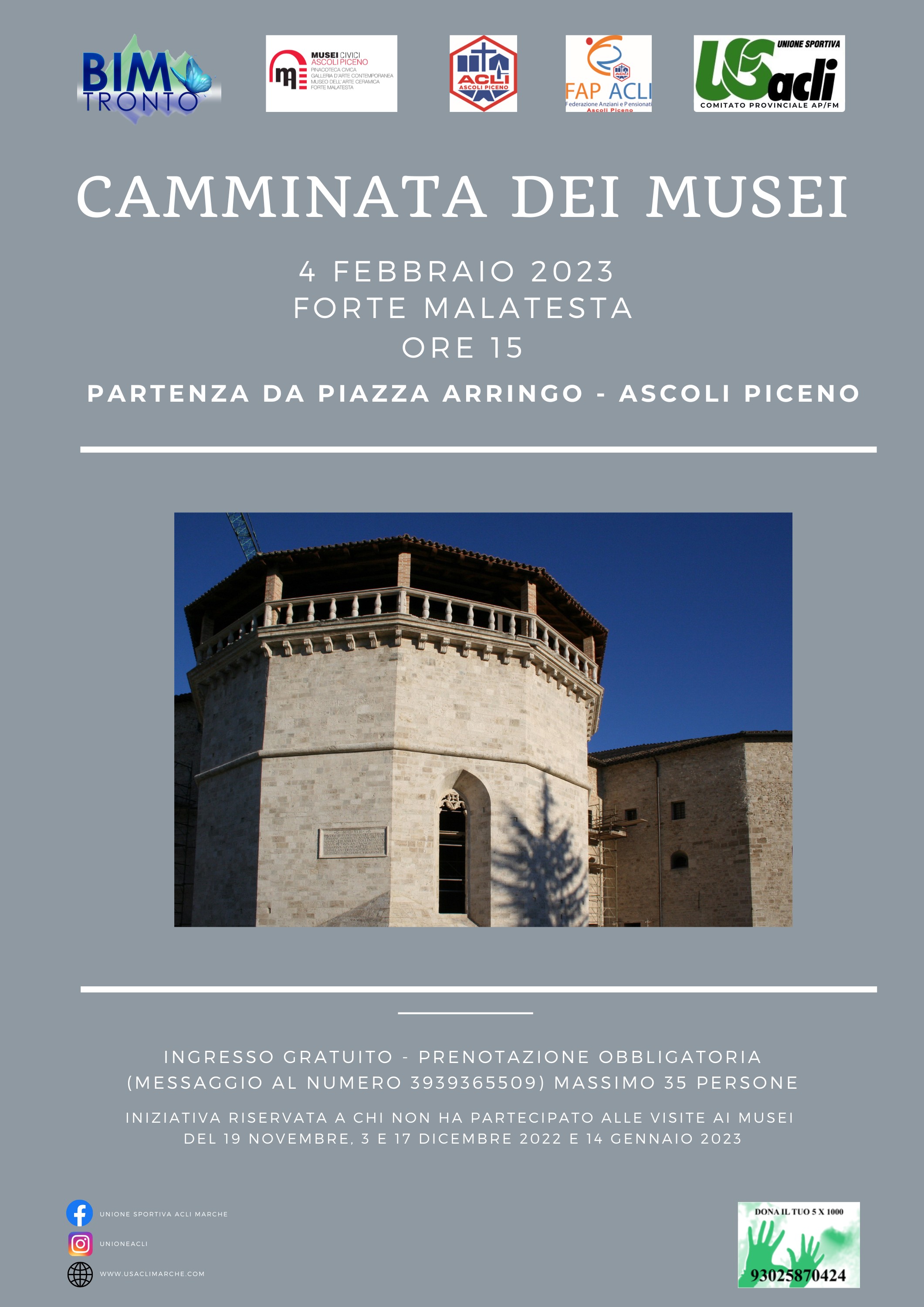 L’U.S. Acli Provinciale, grazie al sostegno di Bim Tronto, Fap Acli ed Acli provinciali di Ascoli Piceno, infatti si svolgeranno due tour culturali che avranno come destinazione la Pinacoteca Civica ed il Forte Malatesta al cui interno è situato il Museo dell’alto medioevo.