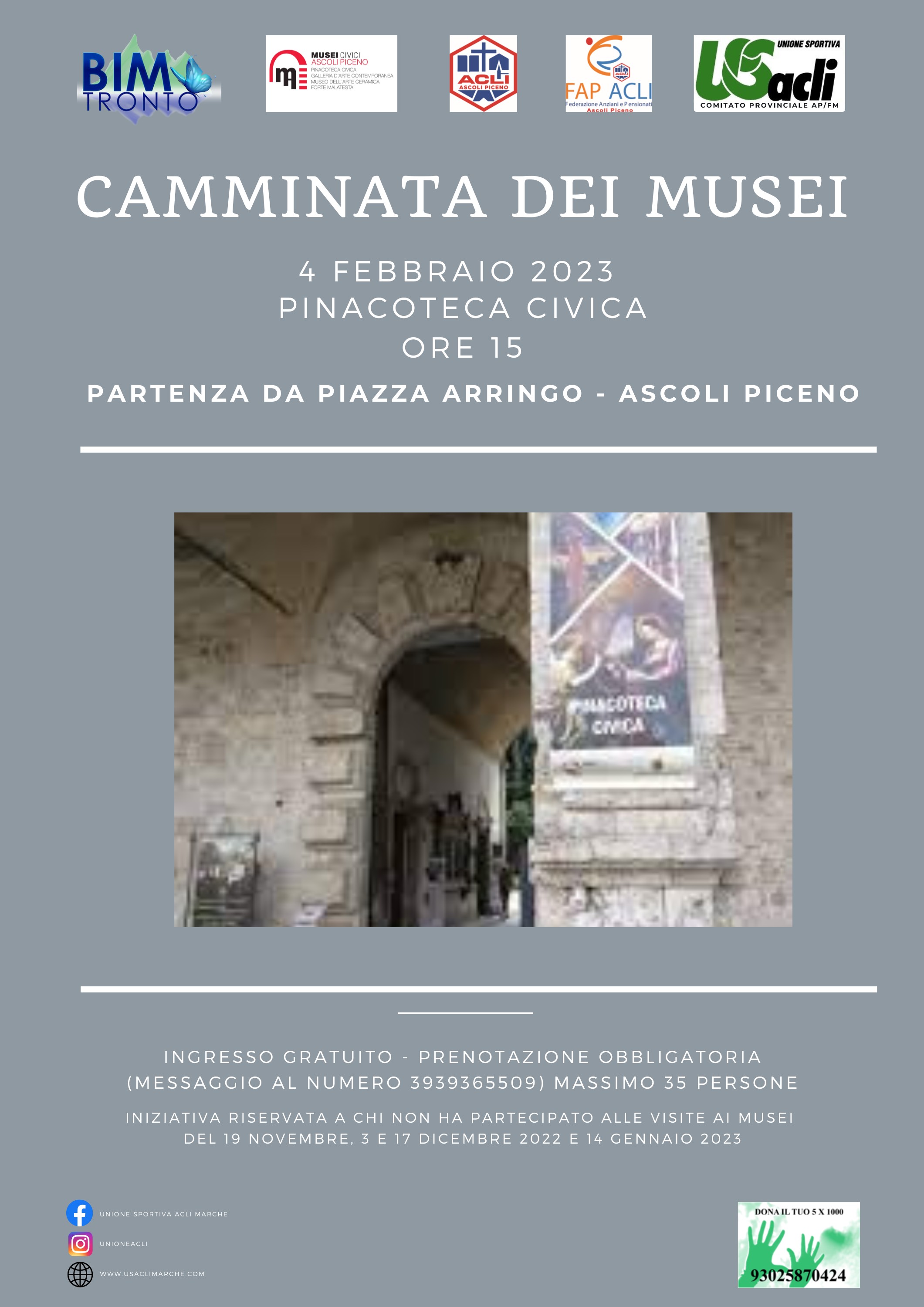 Il progetto “Camminata dei musei”, a cura di U.S. Acli provinciale, che è giunto alla nona edizione edizione, favorisce la conoscenza e la valorizzazione di strutture museali del territorio. Sono stati realizzati finora 69 eventi con oltre 2700 presenze registrate.