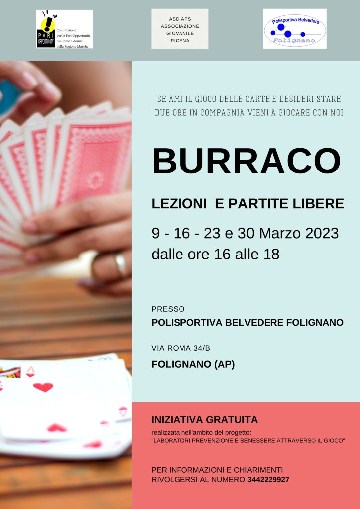 Dal 9 al 30 marzo, ogni giovedì dalle 16 alle 19, sono in programma lezioni e partite libere di burraco presso la sede della Polisportiva Belvedere in via Roma 34/b a Folignano.