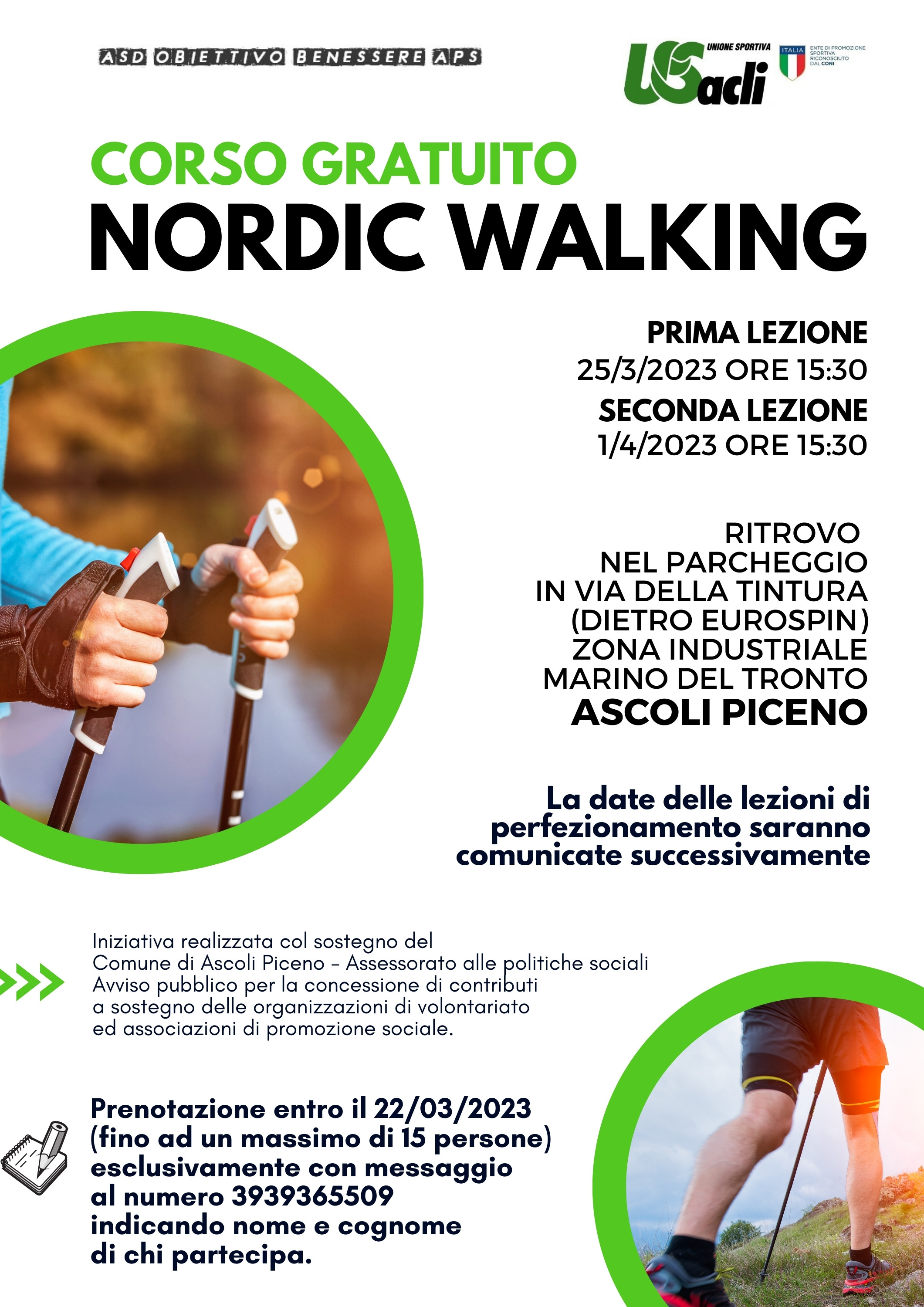 ASCOLI – Grazie alla collaborazione di ASD APS Obiettivo Benessere, U.S. Acli provinciale Aps e Assessorato alle politiche sociali del Comune di Ascoli Piceno, il 25 marzo (dalle 15,30) si svolgerà un corso gratuito di Nordic Walking riservato ad un massimo di 15 persone.