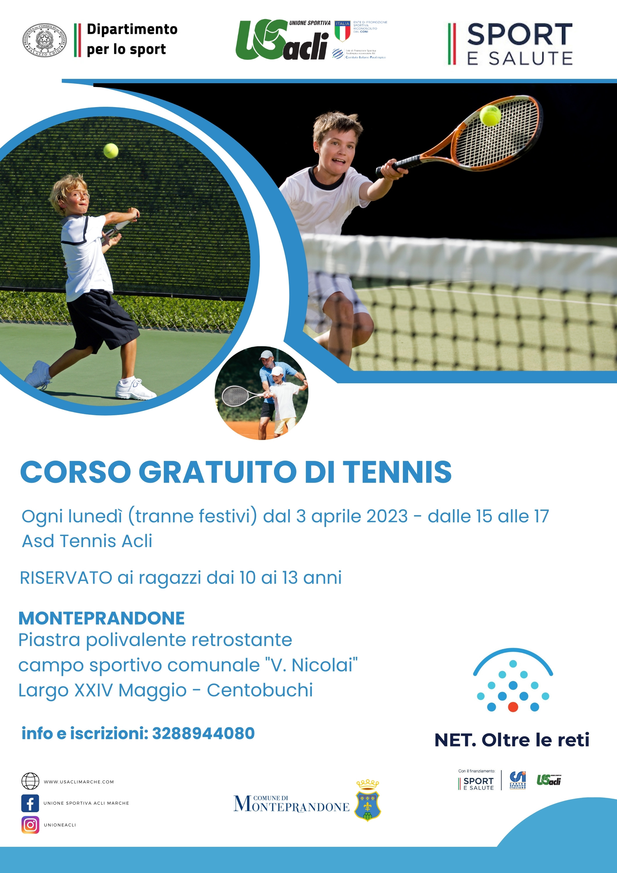 MONTEPRANDONE – Prenderà il via il 3 aprile un corso gratuito di tennis riservato ai ragazzi dai 10 ai 13 anni.