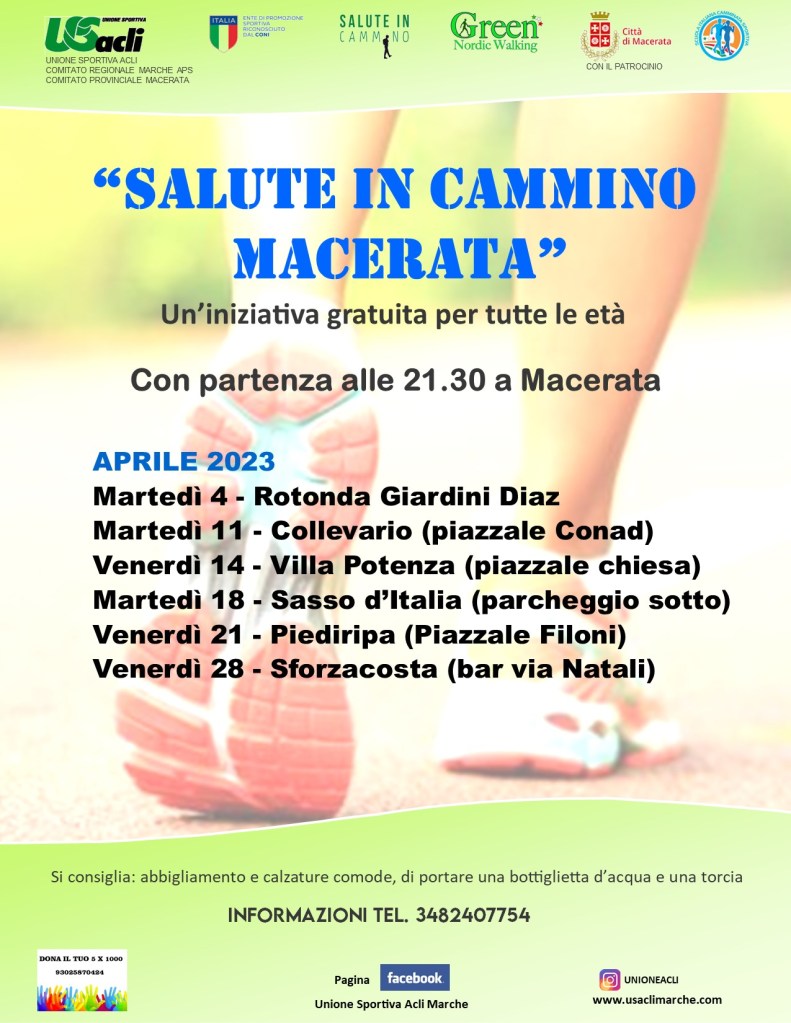 Si tratta di una iniziativa organizzata dall’U.S. Acli Marche Aps, dall’U.S. Acli provinciale di Macerata Aps, dalla Scuola italiana di camminata sportiva, dall’Asd Green Nordic Walking, col patrocinio dell’amministrazione comunale di Macerata.