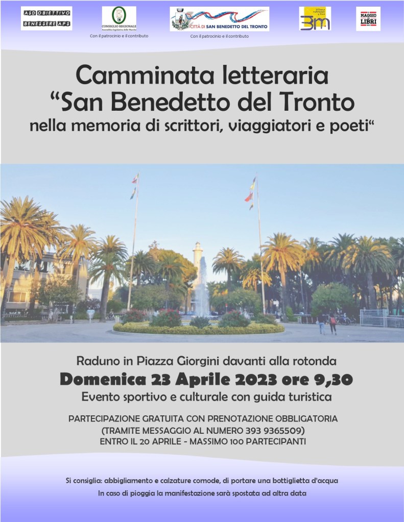 SAN BENEDETTO DEL TRONTO – Domenica 23 aprile, con partenza davanti alla rotonda di Piazza Giorgini alle 9.30, si svolgerà la manifestazione “San Benedetto del Tronto nella memoria di scrittori, viaggiatori e poeti – Camminata letteraria”.