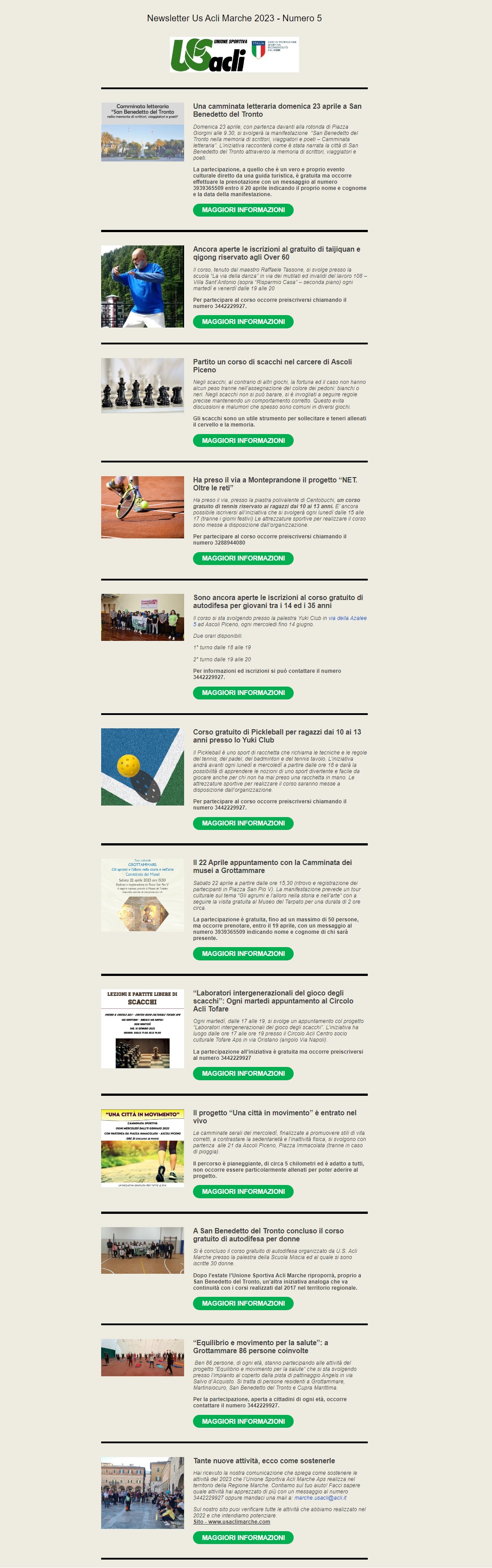 aprile 19, 2023 Unione Sportiva Acli Marche Newsletter n.5 del 19 aprile 2023 Condividi: Fai clic per condividere su X (Si apre in una nuova finestra) X Fai clic per condividere su Facebook (Si apre in una nuova finestra) Facebook Mi piace Caricamento... Correlati