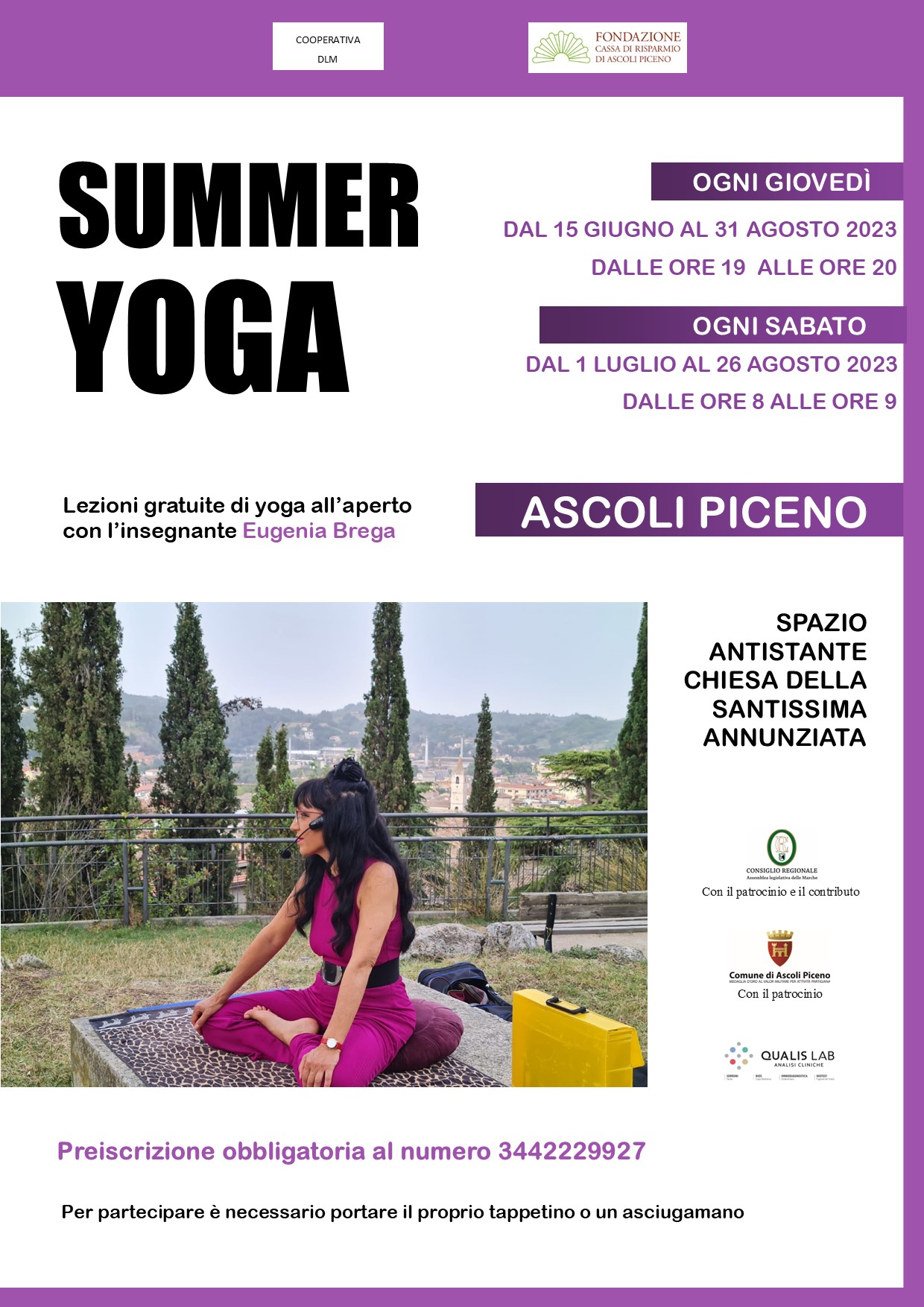 ASCOLI – Dopo il successo ottenuto nelle precedenti edizioni dell’iniziativa, tornano le lezioni di yoga tenute dall’insengnante Eugenia Brega nel Parco dell’Annunziata.