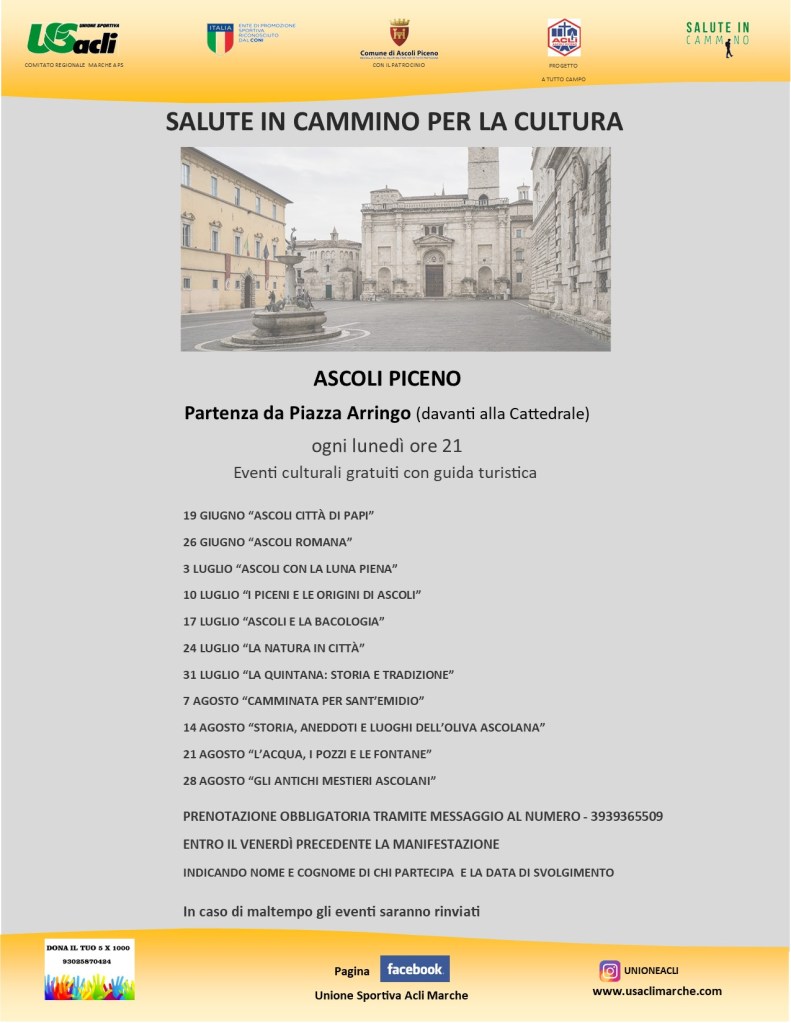 Il 19 giugno riparte l’iniziativa “Salute in cammino per la cultura” promossa per il sesto anno consecutivo dall’Unione Sportiva Acli Marche Aps.