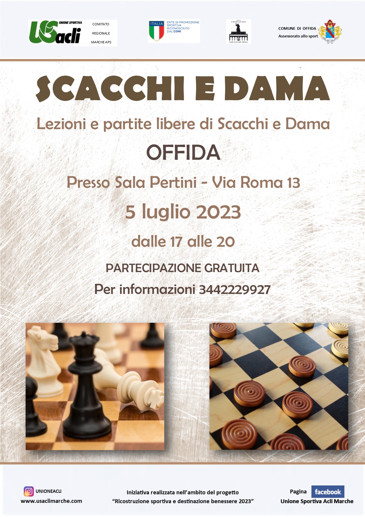 Nell’ambito del progetto “Ricostruzione sportiva e Destinazione Benessere 2023”, mercoledì 5 luglio si svolgeranno lezioni e partite libere di scacchi e dama ad Offida.