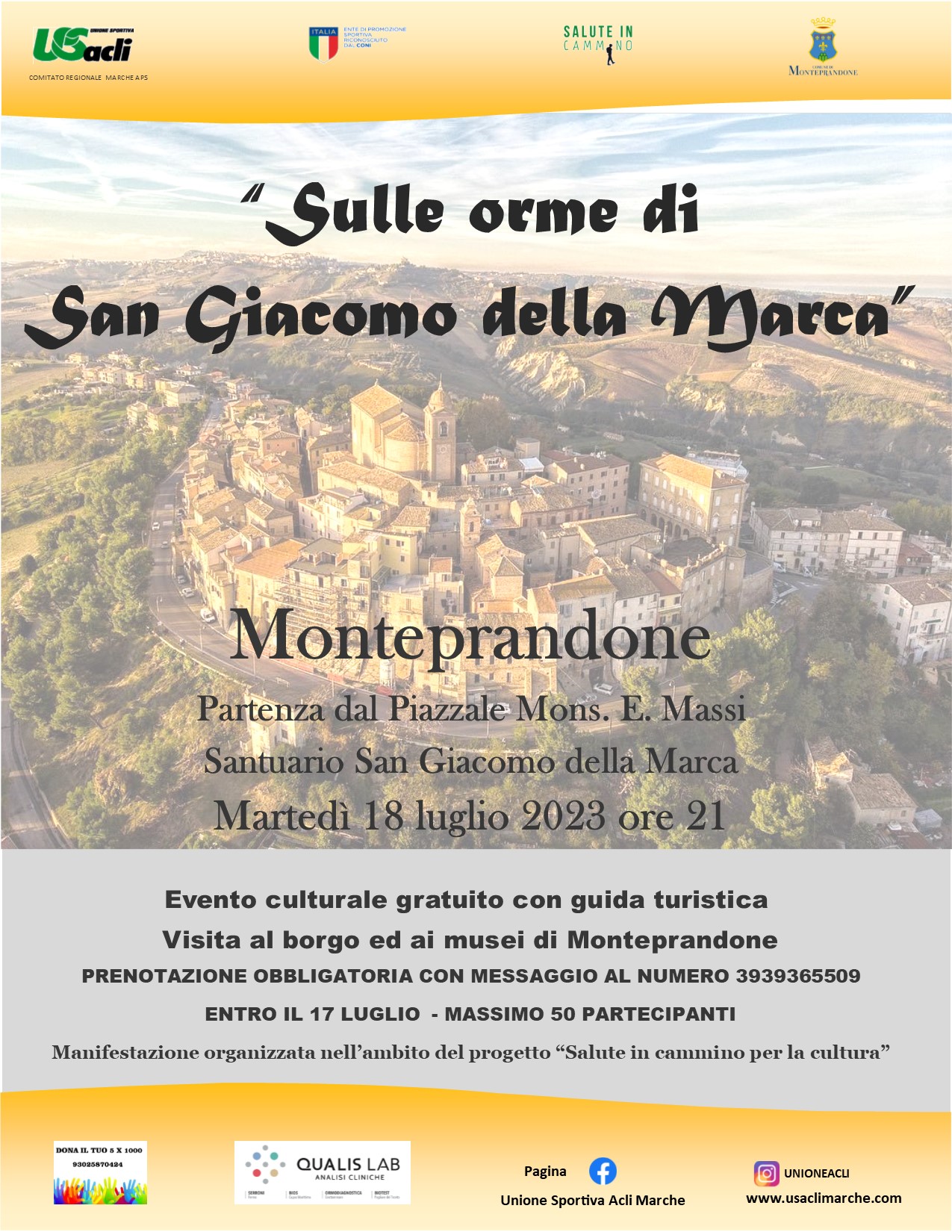 Secondo appuntamento, martedì 18 luglio a Monteprandone, con “Salute in cammino per la cultura” L’iniziativa dell’Unione Sportiva Acli Marche Aps, che ha già fatto tappa in altre città come Ascoli Piceno, San Benedetto del Tronto ed Offida, specie nel periodo estivo, viene realizzata di nuovo a Monteprandone con un evento che si abbina con quello che si è svolto lo scorso 20 giugno.
