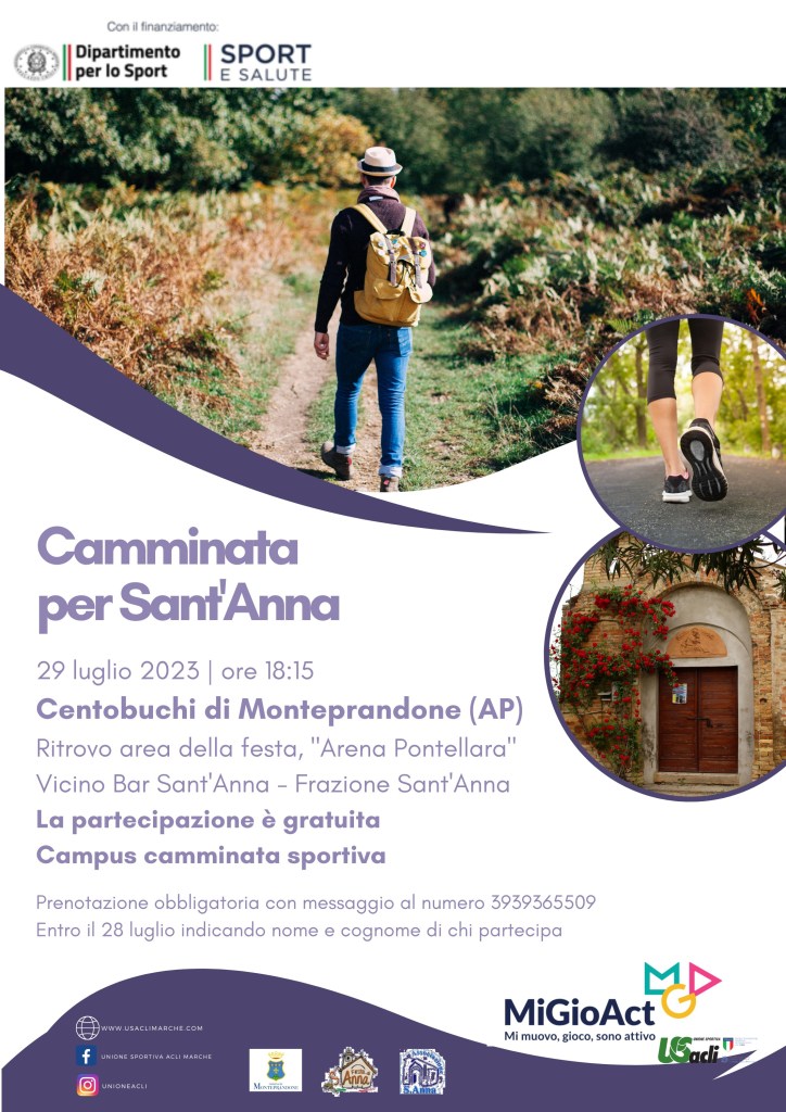 MONTEPRANDONE – Il 29 luglio si rinnova l’appuntamento con la “Camminata per Sant’Anna” che prenderà il via alle 18.15 presso l’area della festa “Arena Pontellara”, vicino al Bar Sant’Anna di Centobuchi.