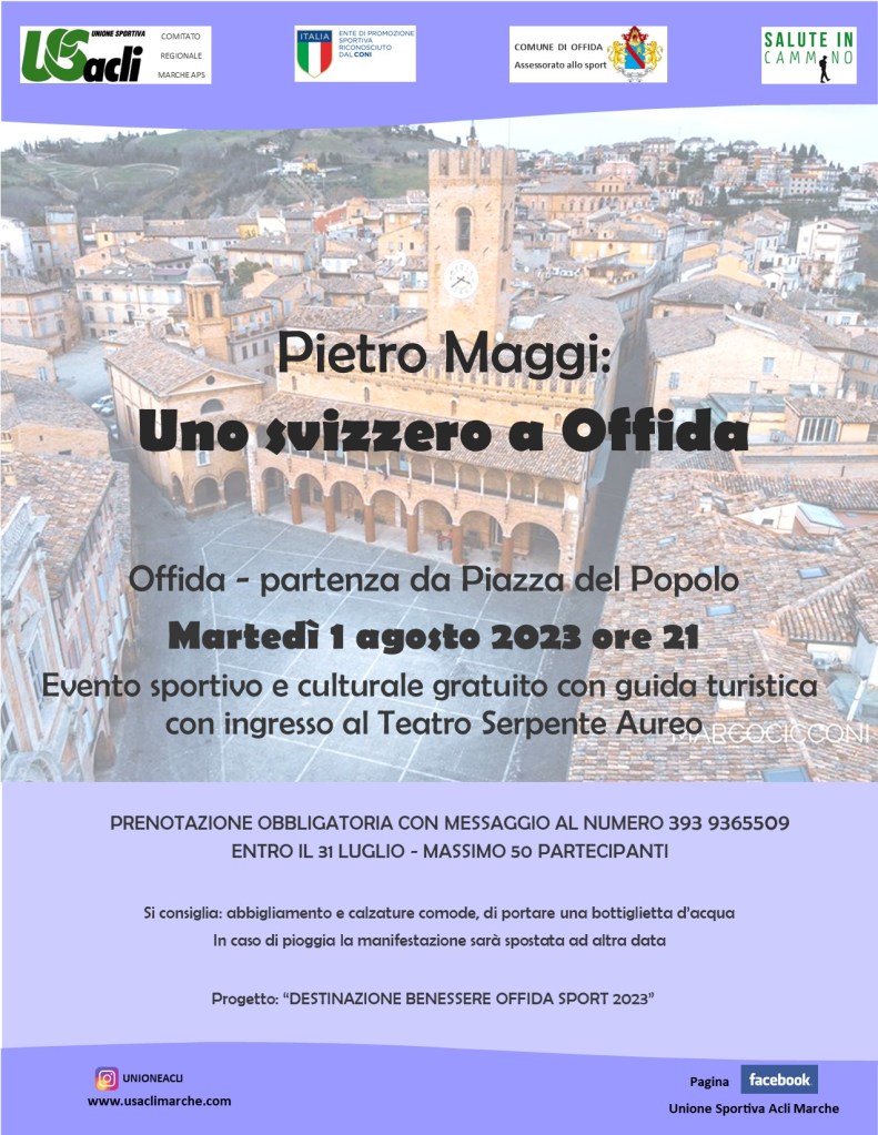 OFFIDA – Martedì 1 agosto, alle 21, con partenza in Piazza del Popolo, è in programma l’evento sportivo e culturale con guida turistica “Pietro Maggi: uno svizzero a Offida”.