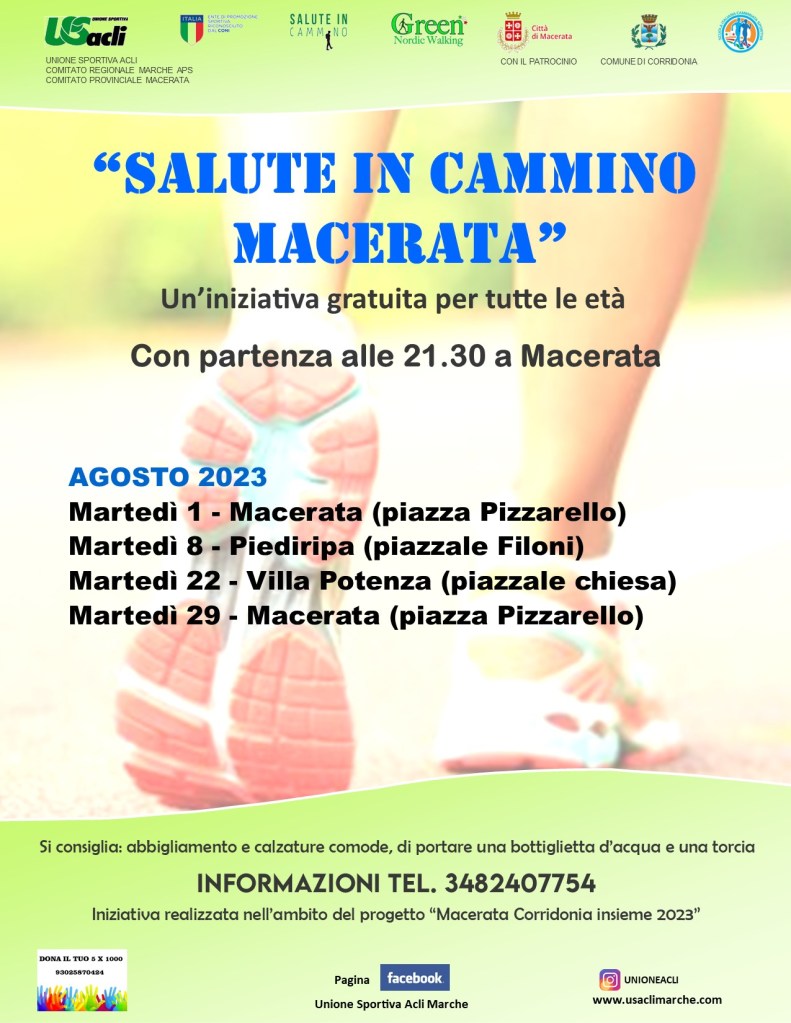 Si tratta di una iniziativa organizzata dall’U.S. Acli Marche Aps, dall’U.S. Acli provinciale di Macerata Aps, dalla Polisportiva Acli Macerata, dalla Scuola italiana di camminata sportiva, dall’Asd Green Nordic Walking, nell’ambito del progetto “Macerata Corridonia insieme 2023”.